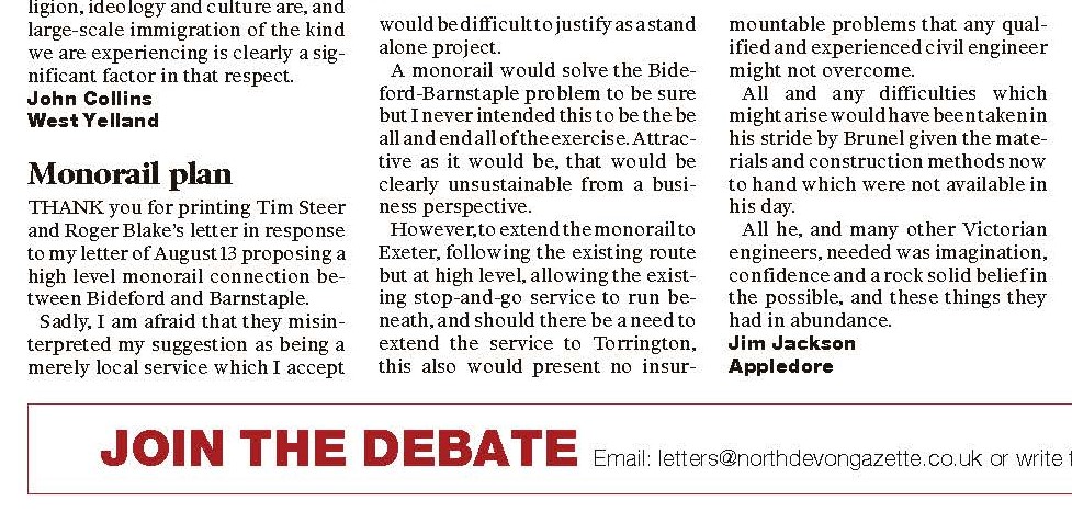 - September - "Mainline mission for rail future" write Railfuture's Devon and Cornwall regional branch Chair Tim Steer and Acting Convener of the Northern Devon Railway Development Alliance Roger Blake in a joint letter to the North Devon Gazette, on the 3rd. A reply "Monorail plan" came a week later.