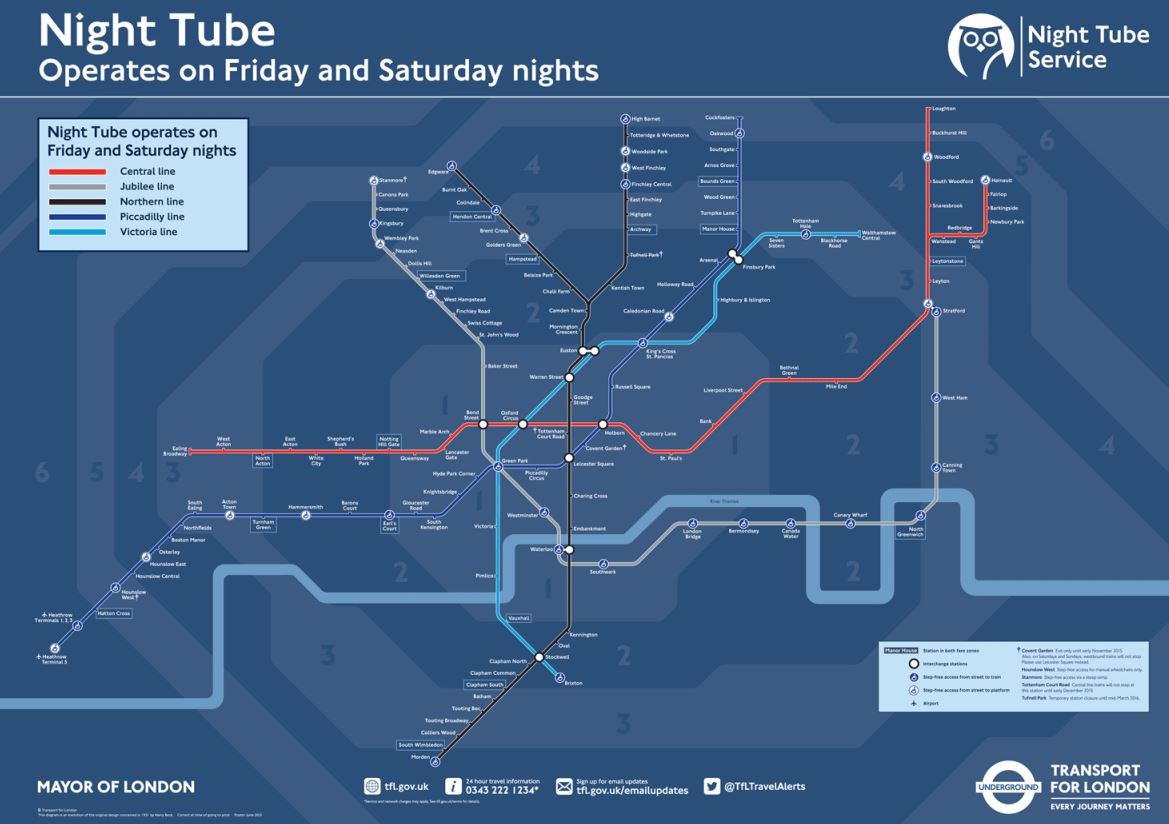 Transport for London map showing the lines covered by the first phase of the Night Tube (109kB)