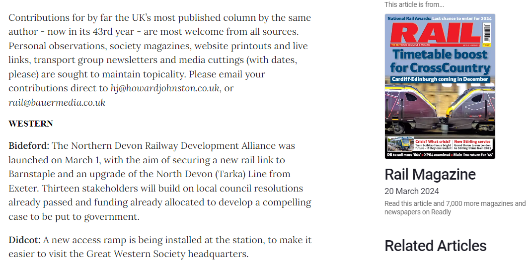 04/03/2025 - "Making the North Devon line a 21st-century railway" - North Devon Today (135kB)