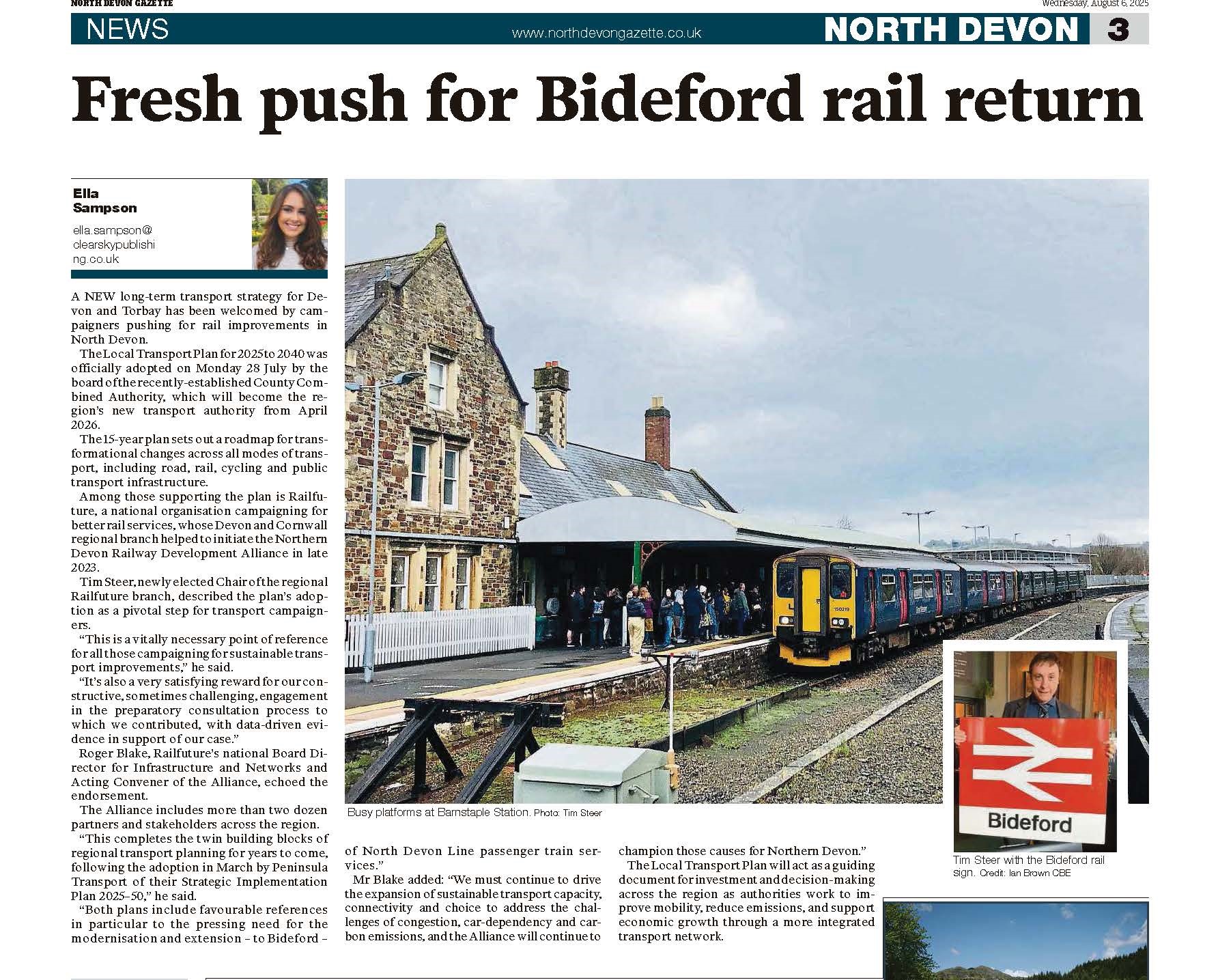 20/08/2025 - Devon & Torbay Local Transport Plan 2025-40 "actively supports reopening the railway from Barnstaple." - RAIL magazine (129kB)