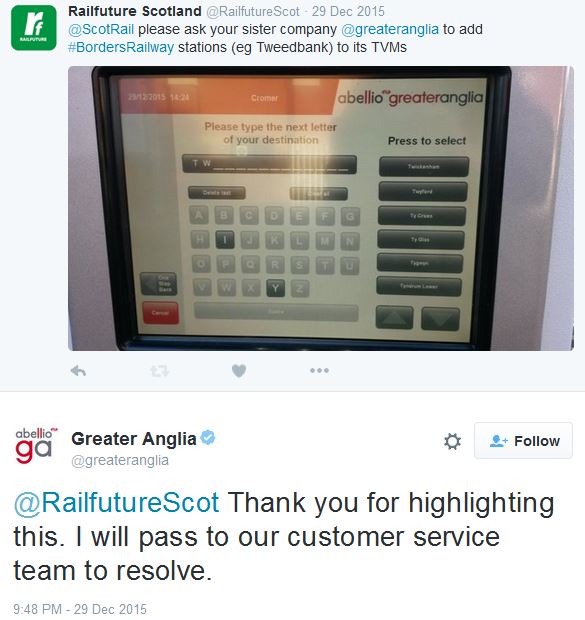 Railfuture Tweets that Borders Railway stations do not appear on some TVMs (61kB)