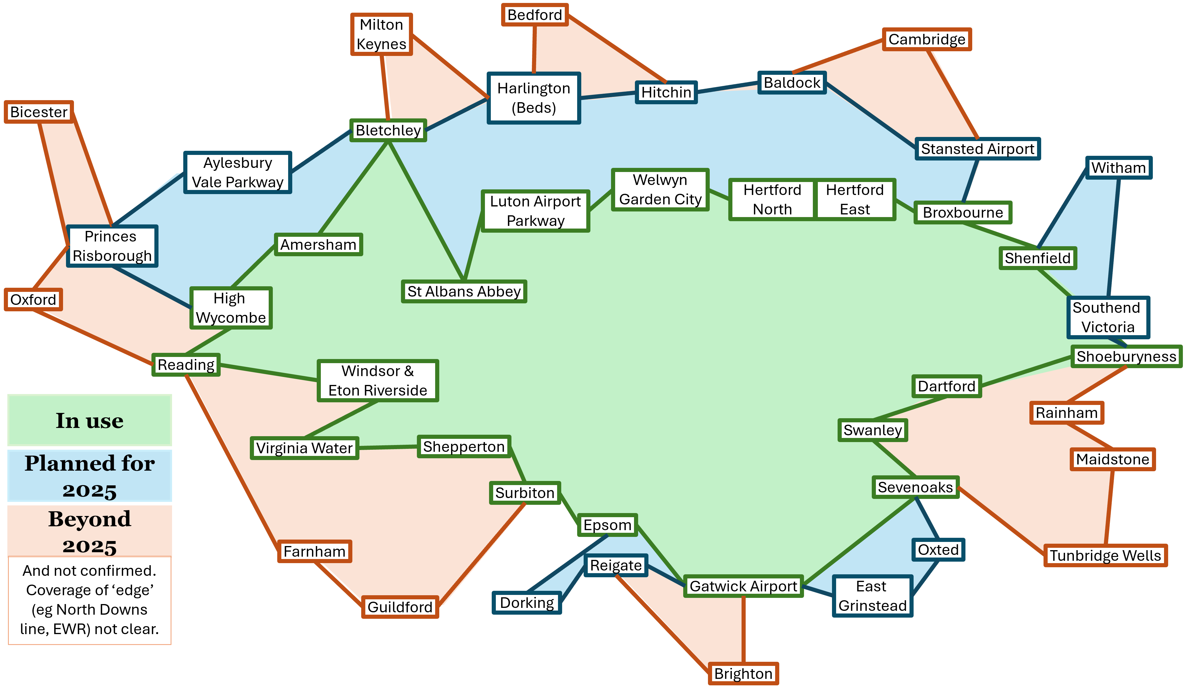F: (the final scope ~ due after 2025 and subject to change): A boundary of Bedford, Cambridge, Witham, Rainham, Maidstone, Tunbridge Wells, East Grinstead, Brighton, Guildford, Aldershot, Didcot, Oxford, Bicester and Milton Keynes, including Stevenage, Tonbridge, Three Bridges, Haywards Heath, Redhill, Woking, Wokingham, Farnham & Didcot.