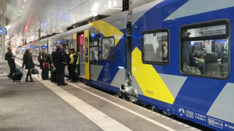 17/01/2016 - Passengers board a German Meridian train to Munich through a single door where tickets are inspected (64kB)